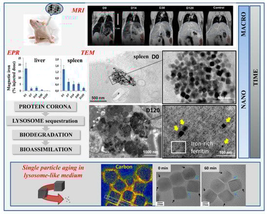 Multiscale follow-up of iron oxide nanocubes over time using in vivo magnetic resonance imaging (MRI) in mice, ex vivo electron paramagnetic resonance (EPR) quantification in organs, TEM observations of intracellular distribution and morphological biotransformations (reproduced with permission from [].