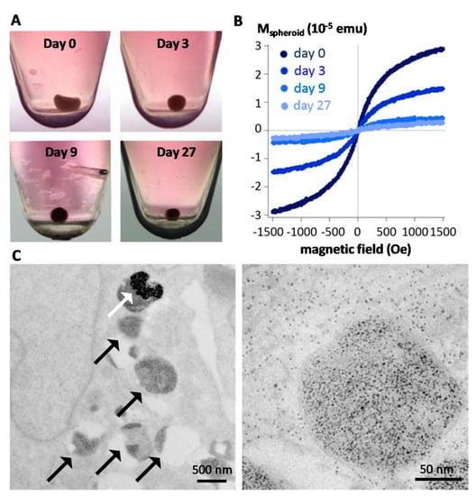 Although in vivo studies have been instructive to reveal the long term fate of magnetic particles, methods to monitor quantitatively their structural integrity remained challenging to implement in situ, within the cells, and in the long-term []. One emerging approach is to use cell spheroids [,], which stands as a closed system allowing them to be kept in culture for long (up to a few months for stem cells-based spheroids, Figure 3A), and harboring nanoparticles within each of the component cells, internalized right before spheroid formation. Multiscale physical measurements (magnetism, calorimetry, optics) can be performed quantitatively at the single spheroid level and qualitatively by imaging at the nanoscale. First, the spheroid magnetism is a direct fingerprint of nanoscale transformations. Figure 3B shows typical spheroid magnetization curves at different time periods, up to one month, evidencing a massive degradation of the nanoparticles inside the spheroid over time []. This is confirmed by electron microscopy observation (Figure 3C), as well as the appearance of multiple ferritin nanoparticles while almost no nanoparticles remain intact for long time periods [,]. Unfortunately, this degradation translates into a loss of heat generation at the spheroid level upon magnetic hyperthermia application [], raising an issue for sequential magnetic hyperthermia application in therapy. However, strategies have emerged to prevent the biodegradation of the magnetic core and, in turn, preserve magnetic hyperthermia functionality. One of them is to shield the magnetic core with an inert gold shell [,], and another one is to protect the core with a polymer coating []. Alternatively, another strategy could be to seize the capacity that some human cells must biosynthesize magnetic nanoparticles anew from the iron delivered by the degradation of synthetic nanoparticles, thus providing the cells with biogenic non-degradable nanoparticles and long term magnetism [,].