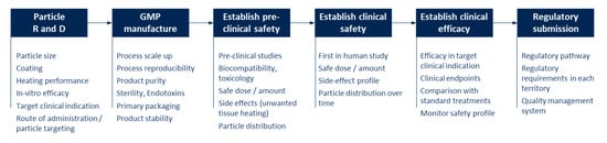 However, even for MNPs that have been successfully manufactured in the lab and shown promising performance in in vitro and small animal studies, the route from research to regulatory approval and commercialization is complex, expensive and time-consuming, with many aspects to consider at each stage (Figure 4). Undoubtedly this has proven a barrier to the clinical translation of magnetic hyperthermia. Each step requires significant investment, and failure at any stage can lead to delay or discontinuation of the product.