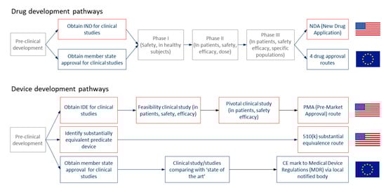 Development and regulatory pathways for drugs and devices in the US and Europe. IDE stands for Investigational Device Exemption, while IND stands for Investigational New Drug Application.