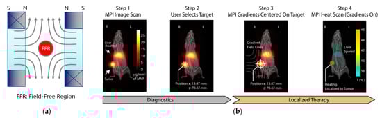 - Chandrasekharan, P.; Tay, Z.W.; Hensley, D.; Zhou, X.Y.; Fung, B.K.; Colson, C.; Lu, Y.; Fellows, B.D.; Huynh, Q.; Saayujya, C. Using magnetic particle imaging systems to localize and guide magnetic hyperthermia treatment: Tracers, hardware, and future medical applications. Theranostics 2020, 10, 2965. [Google Scholar] [CrossRef]