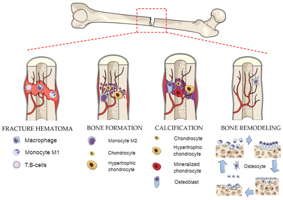 The present understanding of the biomechanical processes that affect healing is based on the natural bone formation process, which can be divided into two stages: primary and secondary bone healing. Primary bone healing occurs when the fracture is rigidly stabilized and the gap is less than 0.1 mm. The bone formation is provided directly by osteoclasts and osteoblasts. Secondary bone healing occurs when only a small movement at the fracture appears [31]. In general, multievents, such as blood clotting, inflammatory response, fibrocartilage callus formation, intramembranous and endochondral ossification, and bone remodeling are involved in the secondary bone fracture repair [32]. In one study, another type of fracture, called the critical size bone defect, is mentioned; it is defined as the large cavity in a bone that cannot regenerate itself naturally [33]. In such a situation, bone repair may delay bonding or even stop fixation, and substitutes for bone defect treatments can be necessary. A hematoma initiates a proinflammatory cascade [34,35]. Additionally, the environment with low pH and a raised level of lactate leads to increased activity of angiogenic factors [36]. Bone formation starts with the change of the monocyte M1 to anti-inflammatory macrophages (M2), which secrete a battery of cytokines and growth factors to promote tissue repair and angiogenesis [37]. In the fracture gap, the progenitor cells undergo chondrogenesis to form bone [35,36]. Calcification is a process of direct bone formation in which osteochondral progenitors differentiate directly into osteoblasts. Osteoblasts synthesize extracellular matrix containing collagen type I and coordinate matrix mineralization. The conversion of cartilage to the bone during endochondral ossification occurs simultaneously with the appearance of blood vessels. During bone remodeling, the cartilage becomes fully transformed into the trabecular bone and remodeled into the cortical bone, which fills the full defect of the fracture and is almost indistinguishable in form and function from the native bone [38].