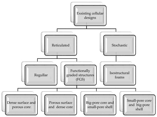 Porous structures exist in many forms, both stochastic (irregular), such as expanded or reticular (regular) foams, or as grid structures or meshes with continuously repeating elementary cells (Figure 2) [11,52,53].