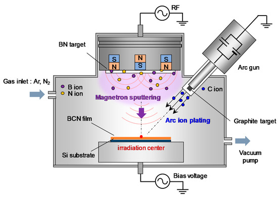 To overcome these shortcomings, the application of a-BCN films on iron-based material has been explored in recent years. a-BCN film has nearly the same properties as the DLC film, is also inert against steel material [10,11], and has an even superior tribological property [12,13] and thermal stability [14,15,16]. In particular, a weak dependence on the relative humidity of wear and friction coefficients [13], and excellent sliding characteristics even in a high temperature environment of 300 °C [16] are incredible features of a-BCN film as compared to DLC film. Certainly, it is true that c-BN has advantages in terms of heat resistance or inertness against steel material as compared to a-BCN film, which is relatively easy to synthesize, whereas high temperature and high pressure are required to synthesize c-BN. Chemical vapor deposition (CVD) and physical vapor deposition (PVD) are the mainly used techniques for the synthesis of a-BCN films. In the CVD process, a-BCN film is deposited on the substrate via a vapor-phase chemical reaction process. Many researchers have synthesized a-BCN film using many kinds of CVD processes, such as thermal CVD [17] and cold wall CVD [18] plasma CVD methods [19,20] under various coating conditions. However, because hydrogen-based gas is usually used as a raw material in the CVD process, these coatings are often soft (owing to the presence of hydrogen in the film structure). For example, according to Thamm et al., the hardness of a-BCN films with a high hydrogen content shows a value of around 13 to 15 GPa, and it increases as the hydrogen content decreases [19]. On the other hand, because the PVD method uses a solid material as raw material, it is possible to synthesize hydrogen-free hard films safely and easily without using toxic or flammable gases, as in the CVD method.