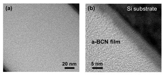 Figure 2 shows the cross-sectional TEM images of the a-BCN films obtained at low (Figure 2a) and high magnifications (Figure 2b). The thickness of the film is approximately 200 nm. The a-BCN film was found to adhere well to the silicon substrate. The lattice structure of silicon is observed, and there was no other lattice fringe. Therefore, no structural heterogeneity due to intermittent carbon irradiation of the arc gun is observed.