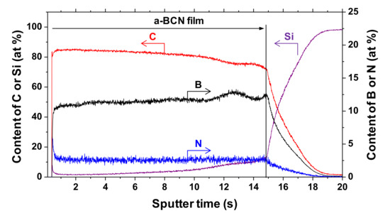 Recently, some studies related to physical vapor-deposited a-BCN films have been reported. Zhou et al. deposited a-BCN film by radio frequency magnetron sputtering from hexagonal boron nitride and graphite targets in an Ar–N2 gas mixture. They investigated the effect of the voltage applied to the substrate on the atomic composition ratio, as well as the hardness and the friction coefficient of the film [21]. Yasui et al. also studied the effect on the elemental composition ratio, film hardness, and friction coefficient of a-BCN film. They prepared the film by the ion-beam-assisted vapor deposition method while changing the sputtering time [22]. Apart from these researches, related to mechanical property evaluations, Todi et al. investigated the correlation between the optical properties and structural properties of the a-BCN film by applying the annealing treatment to the prepared sample [23]. Researching a new deposition method, Yoshida et al. aimed at forming a-BCN films using a sputtering-PBII hybrid system. They discussed the correlation among B–C–N compositions, the structure in the film, and the mechanical characteristics. The bonding state was evaluated by FT-IR, and as for the mechanical properties, a nanoindentation hardness test, an internal stress measurement, and a frictional wear test were conducted [24]. As these studies show, there is wide research on a-BCN films formed by the PVD method, but almost all studies focus individually on the film composition, the mechanical/optical properties of the film, or the film structure. In connection with this research, Yoshida and coworkers tried to clarify the correlation among the composition, properties, and structure of the film [24], but the types of a-BCN samples they prepared were very limited, and the research results cannot be said to be sufficient yet. To expand the application range of a-BCN films, it is necessary to correlate and systematize the structure and its mechanical properties. The objective of this study was to clarify and systematize the correlation between the structural and mechanical properties by evaluating the elemental composition ratio, bonding state, hardness, friction coefficient, and wear volume of the prepared a-BCN film.