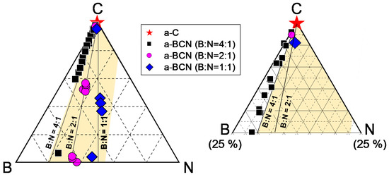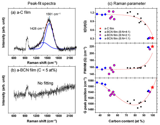 Gaussian fitting was performed on the obtained Raman spectrum, and the G peak position, FWHM(G), and the I(D)/I(G) ratio were derived. Figure 8a shows an example of the fitted spectrum. As shown in Figure 8b, the sample with a carbon content ≤5% could not be fitted. Therefore, peak fitting was performed only for samples with carbon content ≥ approximately 30%. Figure 8c shows the peak fitting results with respect to the carbon content. Although these data were obtained from various a-BCN films with different elemental ratios and structures, they are all plotted on almost the same line. The G peak position gradually decreases as the carbon content increases, but it increases sharply when the carbon content is higher than approximately 80% and approaches that of the a-C film. As for the FWHM(G) and I(D)/I(G), they maintain almost the same value regardless of the carbon content, but change rapidly at a carbon content of 80%, and then approach that of the a-C film. From these results, it can be considered that the structure of the a-BCN film changes continuously with respect to the carbon content and is not affected by the boron/nitrogen ratio. From the results in Figure 4, it was thought that the range of carbon content would differ depending on the ratio of boron and nitrogen. These Raman spectroscopic analysis results also strengthen this conclusion, i.e., the ratio of boron and nitride limits the amount of carbon that can be incorporated into the film. If there is a defect in the film structure, the G peak position and the I(D)/I(G) value increase, whereas FWHM(G) decreases [35,36]. This has also clarified that this Raman parameter shows an opposite tendency when the film quality is improved by the ion assist method [37] or by increasing the incident energy of ions [38], i.e., the G peak position and the I(D)/I(G) value decrease, whereas FWHM(G) increases. Therefore, the structure of a-BCN deteriorates at low carbon contents, which affects the quality of the film.