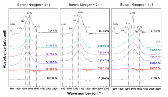 Figure 5 shows the IR spectra of the a-BCN films. Broad peaks around 1000 to 1700 cm−1 are observed when the carbon content is <90%, whereas there is no noticeable peak when the carbon content is >90%. The broad peaks are a combination of the h-BN-bond-derived peak at 1380 cm−1, the CN-bond-derived peak at 1300 cm−1, and the BC-bond-derived peak at 1070–1250 cm−1. A weak absorption band near 1050 cm−1 is observed in the film containing more than 90% carbon. This indicates the presence of small amounts of cubic boron carbon nitride (c-BCN) phase in the film. With the increase in the nitrogen content, a peak corresponding to the C=N bond at 1600 cm−1 and a peak corresponding to the C≡N bond at 2200 cm−1 are observed. At a boron and nitrogen ratio of 4:1, the center position of the peak shifts from approximately 1300 to 1400 cm−1 as the carbon content decreases. In other words, B–C and C–N bonds are initially observed, but as the carbon content decreases, the amount of B–C and C–N bonds tends to decrease and that of hBN tends to increase. On the other hand, when the boron and nitrogen ratios were 2:1 and 1:1, there was no significant shift in the peak positions; all the peaks were centered near 1400 cm−1, which corresponds to the peak position of hBN. Furthermore, the peaks become sharper as the carbon content decreases, indicating that boron and nitrogen formed stable hBN bonds. This is because the atomic binding energies of B–C bonds (448 kJ) and C–N bonds (757 kJ/mol) are higher than that of B–N bonds (389 kJ/mol). Hence, B–N bonds are easily broken by C ions, and sharp peaks of hBN appear as the relative content of boron and nitrogen to carbon increases. Previous studies using FTIR analysis on BCN films also reported that the B–N bonding state is the most stable. They concluded that the hierarchy of energetic stability of bonds in BCN follows the sequence B–N > C–C > C–N > C–B > B–B > N–N. The same conclusion was reached despite the different depositions method used in these studies, namely plasma CVD [20,29], ion-beam-assisted deposition [22,30], magnetron sputtering [31], pulse laser deposition [32], or laser abration [33].