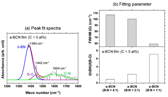 (a) Deconvoluted FTIR spectrum of the a-BCN film (C < 5 at%) with boron and nitrogen ratio of 1:1. (b) I(hBN)/I(B–O) and FWHM (hBN) of the a-BCN films (C < 5 at%).
