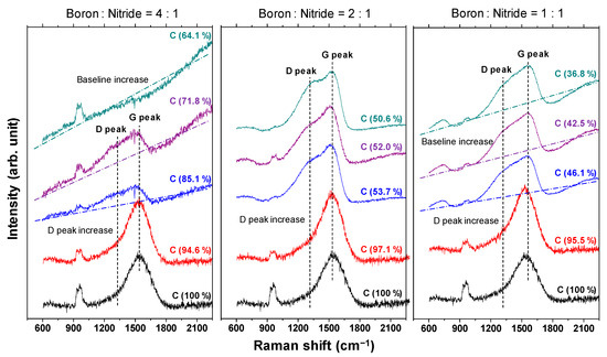 A Gaussian fitting of the peaks in the range of 1300–1500 cm−1 was carried out for samples with carbon content <5%. An example of the fitted spectrum is shown in Figure 6a. Figure 6b shows the results of the peak intensity ratio of hBN and B–O (I(hBN)/I(B–O)) and the full width at half maximum of the hBN peak (FWHM(hBN)) for each sample. It is evident that the closer the B:N ratio is to 1, the higher the I(hBN)/I(B–O) and the smaller the FWHM(hBN). This indicates that the crystallization of the hBN structure has actually progressed. This peak fit result shows that the FWHM (G) when the ratio of boron and nitrogen is 1: 1 was about 55% compared to the case of 4:1.