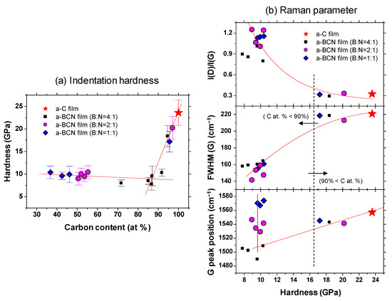 Figure 9a shows the indentation hardness of the a-BCN films with respect to the carbon content. The a-C film exhibits the highest hardness (23.6 GPa), and the hardness decreases linearly with the decrease in the carbon content. The hardness is almost constant when the carbon content is <90%. Figure 9b shows the Raman parameters in correlation with the hardness. In the region where the carbon content is 90% or more, the Raman parameters show almost the same value regardless of the hardness, indicating that these samples have similar structural characteristics. In other words, the mechanical properties of a-BCN film are also significantly affected by the carbon content and its structure. Recently, the correlation between carbon content in the a-BCN film and its properties have been widely discussed. For example, Qin et al. reported that the PL spectra of the BCN nanosheets are dependent on their chemical composition, and it is therefore probable that the excessive carbon atoms form a graphite phase and the nanosheets with the composition of B0.38C0.27N0.35 show intense emission at 3.27 eV with very weak defect-related emission [39]. Nascimento et al. points out the possibility that by doping boron or nitrogen to graphene the doping-induced band gap can vary over an order of magnitude depending on the placement of the boron and nitrogen atoms [40]. Wang et al. and Wu et al. reported that boron-doped graphene exhibits a p-type doping behavior with a considerably high carrier mobility [41,42]. Rani et al. reported that isomers formed by choosing different doping sites differ significantly in relative stability and the band gap introduced, and these aspects depend, to a great extent, upon the position of the boron and nitrogen atoms in the heterostructure [43]. However, these studies are mainly focused on the electrical or nanomechanical properties of a-BCN film. On the other hand, the results shown in Figure 9 indicate that mechanical properties can also be also discussed from the correlation with carbon content. As indicated by the FTIR results (Figure 5), the BCN films were mainly composed of B–N, C–B, and N–C bonds. The h-BN bond has been reported to be a “soft” phase with a graphite-like structure [44,45,46]. Therefore, a higher content of h-BN bonds will adversely affect the mechanical properties of the films. In contrast, C–B and N–C bonds are “hard” bonding structures, which contribute to the enhancement of hardness. As reported by Byon et al. [47] and Chien et al. [48], the C–B and N–C bonds play an important role in determining the mechanical properties by enhancing the global connectivity of the network. Furthermore, it is also well known that the hardness of the film is linearly related to the residual stress in the film [49,50]. The addition of boron and nitrogen to the a-C film enhances the hBN bond and decreases the C–B and N–C bonds or internal stress. In fact, Franceschini et al. observed that the internal stress considerably decreases with the increase in nitrogen content owing to the change in the coordination number [51].