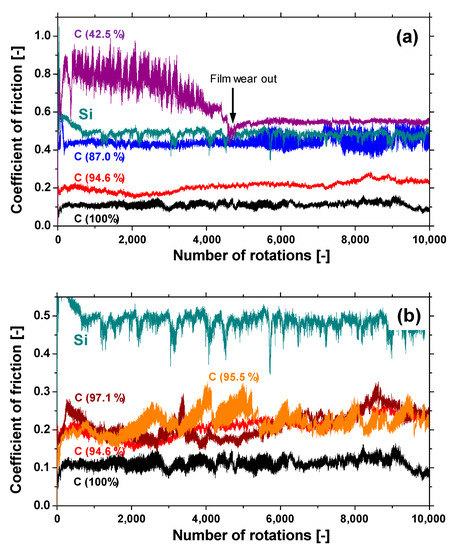 (a) The evolution of the friction coefficient of samples with different carbon content. (b) The evolution of the friction coefficient of samples with a carbon content >90%.