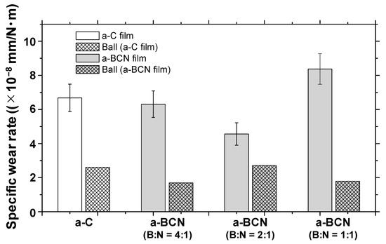 A bearing steel ball (Japan standard, SUJ2) with a diameter of 6 mm was used as the ball sample. The sliding radius was 3 mm, the load was 1 N, and the sliding speed was 400 rpm. The test was carried out under dry sliding conditions. Since the coefficients of friction of a-C and a-BCN films, such as temperature and humidity [3,26,27,28], depend on the sliding environment, the sliding wear tests were conducted under the same environmental temperature (room temperature, 22–26 °C) and humidity of 22–25%.
