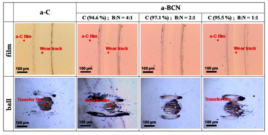 Figure 10a shows the evolution of the friction coefficient of the a-BCN films as estimated from the ball-on-disk wear tests. The a-C film showed the lowest friction coefficient and stable behavior, and the friction coefficient increases as the carbon content decreases. In particular, a sharp increase in the coefficient of friction is observed when the carbon content is <90%. From this result, it is considered that the sliding characteristics are strongly influenced by the structural characteristics of the film and the indentation hardness. In fact, the sample with a carbon content of 42.5% showed higher friction than the silicon substrate. Furthermore, the friction coefficient of the sample with a carbon content of 87% is almost the same as that of the silicon substrate. Thus, it can be concluded that the sliding properties of the silicon substrate can be improved by coating a-BCN film with a carbon content ≥90%. Figure 10b shows the evolution of the friction coefficient of samples with a carbon content >90%. All the samples show stable behavior with a low friction coefficient of approximately 0.1 to 0.2, which is close to that of the a-C film. Figure 11 shows the specific wear rate of each sample. The a-BCN films with a carbon content >90 at.% show similar or lower values of wear rate than the a-C film. However, when the ratio of boron and nitrogen became 1:1, the wear resistance of the film deteriorated. This is because when the ratio of boron and nitrogen becomes 1:1, the amount of B–N bond in the film structure increases, and the film hardness becomes small. Figure 12 shows the optical microscope images of the wear track and the ball after sliding. A black transfer film is observed in all the samples. As discussed in many previous studies, the low coefficient of friction and wear volume of the a-BCN film can be attributed to this “black transfer film”. According to Godet and coworkers [52,53,54], friction and wear behaviors can be discussed using third-body processes. Third bodies, in this case “black transfer films”, are formed by the relative motion of the two parent materials in the sliding contact. They often appear first as thin films transferred to the stationary counterface and then evolve into wear particles [54,55,56,57]. By separating the two parent materials, third bodies play a role in distributing the stresses and accommodating the relative motion between the counterfaces.