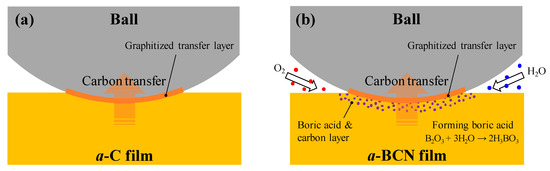 Raman spectroscopic studies were performed to analyze the structure of the transfer film. The red spot in Figure 12 is the focal position of the laser used for Raman spectroscopy. As shown in Figure 13, the position of the G peak shifts to a higher wave number, the FWHM(G) decreases, and the I(D)/I(G) increases after sliding for all the counterface surfaces compared to the as-deposited films. This tendency is particularly noticeable in the film on the ball surface; thus, it is considered that the black transfer film is graphitized. In addition, the tendency of graphitization was greater in the a-BCN film than in the a-C film. It has been reported that a-BCN films containing trace amounts of boron show better tribological properties for iron-based materials than a-C films under wet conditions because the graphitization of the transfer film progresses on the surface of iron-based material [58]. In general, the sliding properties of a-BCN films against iron-based materials depend on the relative humidity. Under a low humidity (5% RH) environment, a-BCN films show a relatively high coefficient of friction (approximately 0.4 to 0.8) owing to the wear caused by boron carbide. On the other hand, under a relatively mild humidity (45% RH) environment, they shows a low coefficient of friction (approximately 0.1) because of the formation of a boric acid layer by the reaction of boron in the a-BCN film with water vapor in the atmosphere [59]. In this study, because the ball-on-disk test was conducted under a mild humidity environment (approximately 25% RH), there was a possibility of formation of the boric acid layer, as shown schematically in Figure 14.