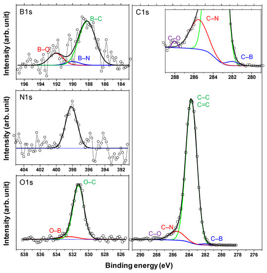 - Prakash, A.; Sundaram, K.B. Optical and XPS studies of BCN thin films by co-sputtering of B4C and BN targets. Appl. Surf. Sci. 2017, 396, 484–491. [Google Scholar] [CrossRef]