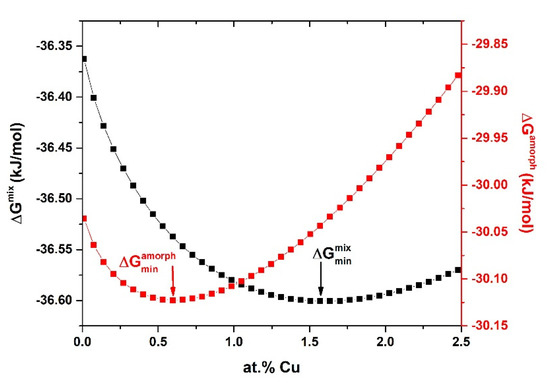 The influence of the copper content on the Gibbs free energy of mixing (ΔGmix) and formation of amorphous phase (ΔGamorph).