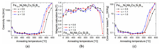 The dependence of the coercivity Hc, the magnetic saturation Bs and the core power losses at 1 T and 50 Hz P10/50 on the annealing temperatures for the as-spun and annealed alloys was presented in Figure 4. A significant improvement in the soft magnetic properties was noticed after the heat treatment at 340 °C. Similar values of Hc, Bs, and P10/50 have been maintained up to 540 °C for the material with Cu content equal to 1.6 at.% and up to 580 °C for the materials with 0.6 at.% and 1.1 at.% of Cu. Heat treatment at higher temperatures was associated with the deterioration of the soft magnetic properties, which was related to the separation of the boride phase. It is worth noting that the temperature of the boride phase formation decreases with increasing copper content in the materials. Table 1 shows magnetic properties of ribbon cores before and after 20 min isothermal annealing at characteristic temperatures: 360, 460, and 560 °C. Additionally, the results for Fe72Ni8Nb4Si2B14 annealed at 370 °C are provided for comparison. The alloys annealed at 360 °C differ significantly from the as-spun alloys. There was a 3.36–3.42-fold decrease in Hc, a 4.16–4.63-fold decrease in P10/50, and an increase in Bs by 7.4–18.6% compared to the non-annealed samples. The improvement of soft magnetic properties is related to the relaxation of stresses that arose during the rapid cooling of materials in the melt-spinning process. The temperature of 460 °C corresponds to the optimal annealing temperature for which the Hc value is the lowest for all ribbons. It is worth mentioning, that the material with 1.1 at.% Cu content had the lowest Hc and P10/50 values. The last characteristic temperature, i.e., 560 °C, corresponds to the annealing temperature, at which the boride phase begins to form. At this annealing temperature, the materials have the highest value of Bs equal to 1.31 T for 0.6 at.% Cu and 1.41 T for both 1.1 and 1.6 at.% Cu.