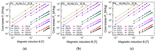 Core power losses Ps of annealed at 460 °C metallic ribbons: Fe71.4Ni8Nb4Cu0.6Si2B14 (a), Fe70.9Ni8Nb4Cu1.1Si2B14 (b) and Fe70.4Ni8Nb4Cu1.6Si2B14 (c) measured at 50 Hz–400 kHz in function of magnetic induction.