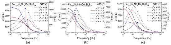 Magnetic permeability µ′ and magnetic loss permeability µ″ dependence as a function of frequency for samples annealed at 360 °C (a), 460 °C (b), and 560 °C (c).