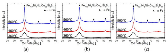 XRD patterns of Fe71.4Ni8Nb4Cu0.6Si2B14 (a), Fe70.9Ni8Nb4Cu1.1Si2B14 (b) and Fe70.4Ni8Nb4Cu1.6Si2B14 (c) annealed at 360 °C, 460 °C, and 560 °C.