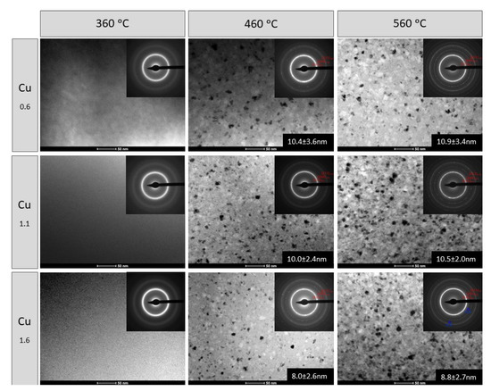 Figure 8 presents a set of bright field (BF) images along with selected area electron diffraction patterns (SAEDPs) of Fe72−xNi8Nb4CuxSi2B14 ribbons containing 0.6 at.%, 1.1 at.% and 1.6 at.% Cu, annealed at 360, 460, and 560 °C. Regardless of the Cu content, ribbons annealed at 360 °C show a fully amorphous structure with the characteristic halo observed in SAEDPs. Ribbons heat treated at 460 °C were two-phase composed of α-Fe crystals embedded in an amorphous matrix while the samples after annealing at 560 °C were fully crystalized. SAEDPs were identified as α-Fe phase. However, in SAEDPs of ribbons containing 1.6 at.% of Cu annealed at 560 °C additional reflections corresponding to the Fe2B phase were found. Based on dark field (DF) images (an example of the set of BF, SAEDPs and DF images obtained from the marked reflections of α-Fe phase of Fe72−xNi8Nb4CuxSi2B14 ribbon heat treated at 460 °C), the average α-Fe crystallite sizes were calculated with standard deviations for each sample. The values are presented in Figure 8. With an increase in Cu content the size of the crystallites decreases slightly while with increasing temperature it increases. The smallest α-Fe crystallites, 8.0 ± 2.6 nm in size, were found in the Fe70.4Ni8Nb4Cu1.6Si2B14 ribbon, annealed at 460 °C.