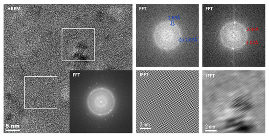 The Figure 9 presents high-resolution transmission electron microscopy (HRTEM), fast Fourier transform (FFT) and inverse fast Fourier transform (IFFT) images of Fe70.4Ni8Nb4Cu1.6Si2B14 annealed at 560 °C. In the FFT, reflections corresponding to the α-Fe crystals and the additional phase were found. The extra phase reflections were indexed according to the Fe2B phase with a crystallite size below 2 nm.