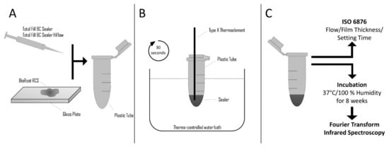 Schematic description of the experimental setup; (A): Total Fill BC Sealer and Total Fill BC Sealer HiFlow were dispensed directly to the vial. Mixing of BioRoot RCS and dispensing to plastic vial; (B): Thermal treatment of the Sealer; (C): Assessment of the physical and chemical characteristics of the sealers tested.