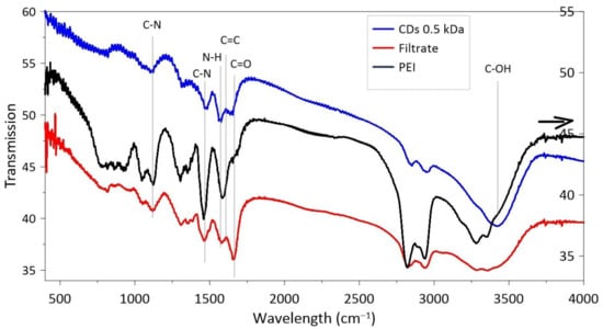Vibrations in the IR spectrum around 1600 cm−1 can be associated with C=C stretching, and around 1650 cm−1 with C=O of amide and carboxylic groups. The stretching vibrations of C=C and/or C=N (~1600–1610 cm−1) bonds confirm the presence of aromatic domains [19]. Both of these bonds are more distinct in the CDs and the dialysate than in pure PEI.