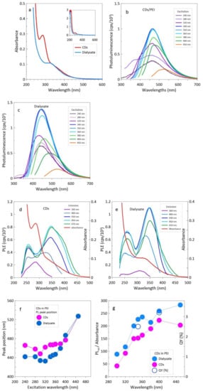 Optical properties of dialyzed CDs and dialysate: (a) absorbance; (b) PL of CDs; (c) PL of dialysate; (d) PL excitations scans of CDs; (e) PLE of dialysate; (f) PL peak position; and (g) ratio of integrated photoluminescence to absorbance (QYrel).