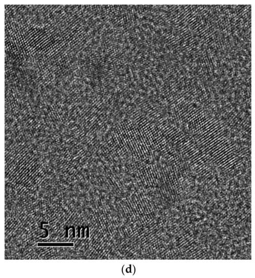 High-resolution TEM images of the nano-structures separated by dialysis are shown in Figure 1. The CDs left in the dialysis bag have crystalline structure and a fairly spherical shape with diameters from 1 to 3 nm (Figure 1a,b). HRTEM images expose distinct crystal fringes with a lattice spacing of 0.22 nm, which corresponds to the plane (100) of the graphite lattice [19].