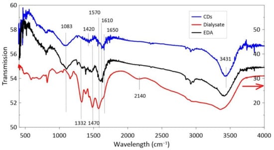 FTIR spectra of CDs synthesized in ethylenediamine (EDA). The red arrow indicates the scale for the dialysate.