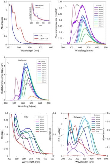 The PLE scans, which show variations of photoluminescence intensity as a function of the excitation wavelength, are presented in Figure 3d,e. In both cases, CDs and dialysate, the strongest emission in a range of 430 to 470 nm is excited with 347 nm, and somewhat weaker with 258 nm. The peaks excited by 347 nm radiation are in the case of dialysate essentially slimmer than those of the CDs. In the case of CDs, the PLE peak for the emission of 360 nm corresponds to the 288 nm absorption peak, and PLE scan for 400 nm shows the share of all three excitation peaks—258, 288 and 347 nm.