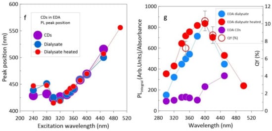 The position of PL peaks and the ratio of integrated photoluminescence to absorbance (QYrel) as well as measured QY are shown in Figure 6f,g, respectively. Photoluminescence quantum yields (QY) were determined from the absolute measurements using an integrating sphere as well as using quinine sulfate (H2O, 0.1 N H2SO4) (QY = 54.6%) and coumarin 153 in ethanol (QY = 56%) as reference standards. It is worth noting that slight overheating of the dialysate during evaporation of excess water resulted in a significant increase in QY for excitation wavelengths shorter than 400 nm. The quantum yield of CDs was below 2% at 350 nm and reached 4% at 450 nm; fluorescence at wavelengths longer than 400 nm has usually been attributed to surface states. The highest QY of dialysate amounting to 10.4% was found at λ = 400 nm, while at λ = 420 nm QY = 8.5%.