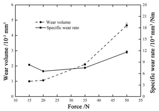 - With the increase in the displacement amplitude (from ±5 μm to ±40 μm) and normal force (from 15 N to 50 N), the wear volume increases, while the specific wear rate decreases first and then increases.