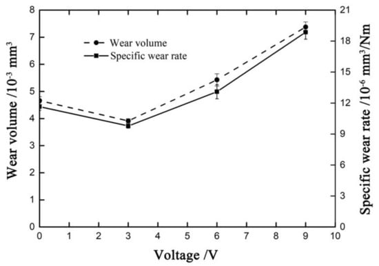 - With the increase in voltage, both wear volume and specific wear rate first increase and then decrease, and reach the minimum value at Vc = 3 V.