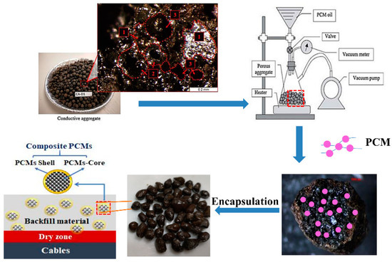 Some studies have shown the application of PCMs to the construction of ground heat exchangers, a condition similar to UPCSs, for which backfill materials are needed to transmit energy [27,28,29]. The large latent heat absorption and clear diminishing of temperature variations during phase transformation are essential for alleviating the impact of UPCSs on the soil temperature field. Furthermore, the intermittent operation of UPCSs on a regular daily schedule facilitates the operation and recovery of the PCM phase process for each cycle, which is very important for long-term stable system operation [30,31]. However, existing studies on cable backfill materials have mostly focused on increasing the thermal conductivity, such that there have been no significant improvements in either the heat accumulation or the heat capacity of these materials. The use of suitable CPCMs to control the thermal environment represents a novel direction in the UPCS field, whereby the thermal properties and stability of CPCMs could be improved for cable engineering.