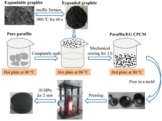 Next, melting impregnation was used to prepare paraffin/EG CPCM: EG was added to completely melted liquid paraffin, and the mixture was stirred mechanically for 3 h to ensure that the paraffin entered the EG pores and the composite was uniformly mixed. The paraffin was fully absorbed by the EG for a mixture with 10 wt.% EG, in accordance with the results of Xia et al. [36]. The composite powders were cooled and compressed into a cylinder with a diameter of 10 mm, height of 10~12 mm, and density of 1.83 g/cm3 by dry pressing in a mold. A pressure of 5 MPa was applied for 120 s to form samples for thermal stability measurements and use as backfill material. The fabrication process of the formable paraffin/EG CPCM is shown in Figure 2.