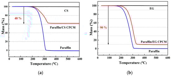 The paraffin mass fraction in the CPCMs is denoted by x. The paraffin mass fraction can be calculated by the formula a(1 − x) + bx = c, where a, b, and c are the mass losses of CS/EG, paraffin, and the CPCMs, respectively. The observation that a = 0 and b = 1 in the curves indicates that the total mass losses of the CPCMs were almost equal to the paraffin load capacity on the CPCMs (i.e., c = x). The paraffin load capacity was determined to be approximately 40% for the paraffin/CS CPCM (Figure 5a) and approximately 90% for the paraffin/EG CPCM (Figure 5b). The higher paraffin load ratio for the paraffin/EG CPCM in comparison to the paraffin/CS CPCM resulted from EG being lighter in weight than CS.
