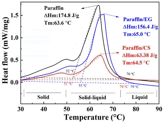 Figure 6 shows the DSC curves for paraffin, paraffin/CS CPCM, and paraffin/EG CPCM. The curves exhibit three distinct phase regions: the first region corresponds to a solid phase below 50 °C, the second region corresponds to a solid–liquid phase transition at approximately 60 °C, and the third region corresponds to a liquid phase in the melting state above 75 °C. Endothermic sample peaks were observed over 50–75 °C, which was consistent with the maximum allowable UPCS operating temperature range.