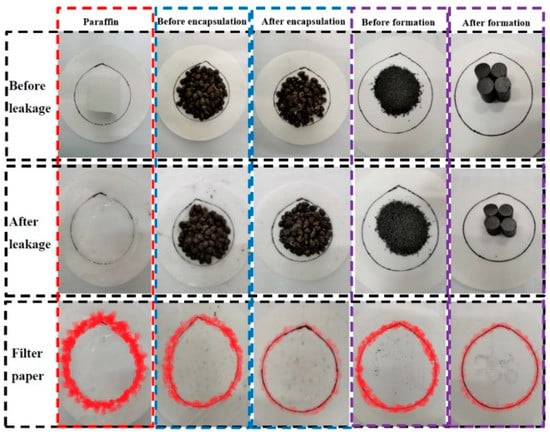 The exudation stability of the samples was characterized by red paraffin traces on the filter papers at the end of the leakage test. Figure 7 shows that most of the molten paraffin reached the edge of filter paper when solid paraffin was the heated sample. When unencapsulated paraffin/CS CPCM was heated, paraffin leakage occurred in the section within the red circle. Little paraffin was observed within the circle for encapsulated paraffin/CS CPCM, suggesting that the encapsulation process can improve the CPCM thermal stability. Similarly, a portion of the paraffin flowed to the edge of the filter paper when paraffin/EG powder was heated. However, a very small quantity of paraffin in the paraffin/EG cylinder was found on the filter paper. The trend in the abovementioned results indicates that the pressed forming process can improve the thermal reliability of paraffin/EG. The overall conclusion is that encapsulation (ER)/formation (dry pressing) can significantly decrease paraffin leakage to improve the long-term thermal reliability [33,38].