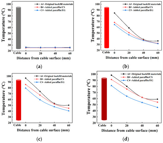 All the temperature readings increased rapidly with time during the initial stage of heat exchange and then rose gradually to reach a stable temperature range. The closer the measuring sensor was to the heat source, the more drastic the temperature fluctuation was. The intensity of the fluctuation decreased with increasing distance from the measurement point to the cable, as shown in Figure 8a–d. The temperatures eventually attained a steady value when the heating time reached 6 h. The equilibrium temperature of sensor (1) for samples A# was significantly higher than that of samples B# and C#. The maximum temperature reduction between samples A# and B# reached approximately 7.1 °C, whereas that between samples A# and C# reached approximately 17.1 °C.