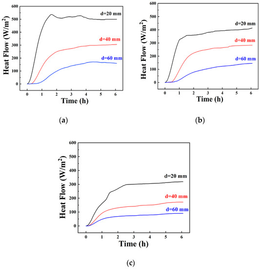 The heat flux q is defined as the heat energy passing through a unit area per unit time during heat conduction. Figure 9a–c shows the recorded heat flux variations in the samples during the heating period. Similar trends are observed for the heat flux variation curves, where the heat flux decreased with increasing distance of the measurement point from the heat source. The heat flux eventually reached a steady value when a constant heat flow was reached. The equilibrium heat fluxes of samples A# at each sensor were clearly higher than those of samples B# and C#. These results correspond to the temperature distribution in Figure 8, which further confirmed the function of the CPCMs in the UPCS. Some disturbances in the heat flux were observed at a 20 cm distance between the sensors and the heat source during the initial heating period because of unstable heat transfer at the site closest to the heat source, which, however, had little effect on the equilibrium heat flux results.