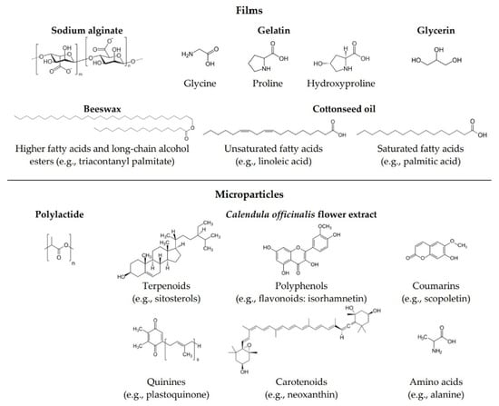 The structure of sodium alginate, glycerin and main constituents of gelatin, beeswax and cottonseed oil used for preparation of films; polylactide for encapsulation; main constituents of Calendula officinalis flower extract enclosed in microparticles.