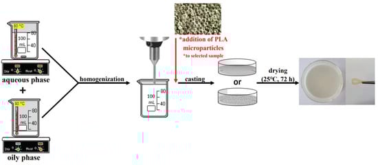 Properties of biopolymer films may be enhanced by adding an oily phase [,,]. Emulsions are dispersed systems composed of two mutually immiscible liquids—the internal (the dispersed phase) is finely dispersed in the external (continuous) phase with the help of emulsifiers, which lowers the surface tension between two phases. Emulsions are widely used in the cosmetic, pharmaceutical, medical, and food industries [,,]. Emulsions generally exhibit certain advantages mainly in that they enhance the therapeutic effect on the skin. Thin emulsion films prepared by the solution casting method have recently garnered more and more attention in the packaging and food industries [,,,].