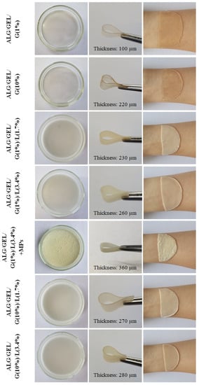 Photographs of prepared polymeric films and swollen polymeric films applied on the volar forearm skin are presented in Figure 3. Films with a higher amount of glycerol, which acts as a plasticizer, were more flexible and sticky. The sample containing 1% glycerol and 3.4% lipids (ALG/GEL/G (1%)/L (3.4%)) was selected to further modification. The emulsion film containing PLA microparticles with incorporated Calendula officinalis flower extract was more brittle than the one without microspheres. PLA microspheres were arranged irregularly and formed agglomerates in some places of the emulsion film.