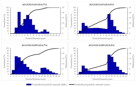 The size distributions of oily particles in prepared emulsions based on sodium alginate, gelatin, different amount of glycerin and lipids (cottonseed oil and beeswax) are shown in Figure 4. Based on the obtained results, we can conclude that we obtained microemulsions. The results also indicate that the oily particles’ size distribution depends on the composition of emulsions, mainly on the amount of oily substances. The emulsions containing a lower amount of lipids had a lower mean size of particles (for ALG/GEL/G (1%)/L (1.7%), the mean diameter was 4.8 ± 0.2 µm and for ALG/GEL/G (10%)/L (1.7%), it was 4.5 ± 0.4 µm). Meanwhile, emulsions with a doubled amount of the oily phase had higher diameters of particles: ALG/GEL/G (1%)/L (3.4%) had 7.4 ± 0.4 µm particles and ALG/GEL/G (10%)/L (3.4%) had 9.9 ± 0.4 µm. The cumulative percentage of normalized particle amount reached a value of 50% at particle diameters of 5.1 and 4.0 µm for emulsions containing a smaller amount of lipids, such as ALG/GEL/G (1%)/L (1.7%) and ALG/GEL/G (10%)/L (1.7%), respectively, as well as 8.8 and 13.1 µm for emulsions with doubled amount of lipids, namely ALG/GEL/G (1%)/L (3.4%) and ALG/GEL/G (10%)/L (3.4%), respectively.