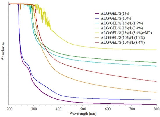 UV-Vis spectra of obtained films based on sodium alginate and gelatin with different amounts of glycerol and lipids, as well as the sample with incorporated PLA microparticles.
