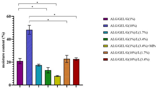 The results of moisture content after drying the samples at 105 °C for 24 h are presented in Figure 7. The measurements revealed that the moisture content of samples depends on the composition of emulsion films: the content of glycerol and lipids. The highest moisture content had polymeric film composed of sodium alginate, gelatin, and 10% glycerol (~48%). The higher amount of glycerol led to the higher moisture content in samples. This is due to the water-holding properties of glycerol so it could have attracted and retained a higher amount of water in the film matrix, primarily by hydrogen bonding. Our findings are in line with other studies investigating the moisture contained in polymeric films with different content of plasticizers [,].