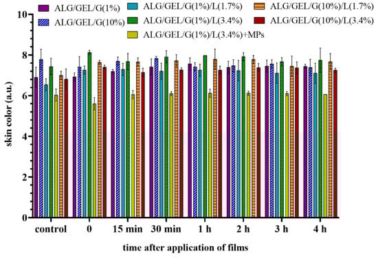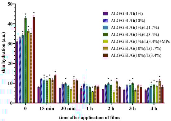 As can be seen in Figure 9, the hydration level of the skin surface (stratum corneum) rocketed after the topical application of polymeric films. The lowest values of skin hydration caused the application of the control samples (without lipids). The addition and increase in the amount of lipids in films resulted in a rise in skin hydration levels. Therefore, the emulsion films containing a doubled amount of lipids led to the highest level of skin hydration (~43 a.u.). The introduction of microparticles into emulsion film slightly decreased its skin hydrating properties (the skin hydration immediately after its application was about 36 a.u.). The results indicate that films increase skin hydration in a process related to the occlusion effect []. However, 15 min after the application of samples, the skin hydration level went down. Until the end of the research, the corneometric indications were higher than the initial level measured before the application of films. Therefore, we can conclude that skin hydration after application of the prepared films compared to the skin hydration before the start of this analysis had statistically significantly improved. However, if we compare the moisturizing properties of emulsion films containing lipids to the ones without oily substances, we can notice that the introduction of lipids contributed to the level of skin hydration except for the sample containing 10% of glycerol and 3.4% of lipids (no significant differences were noticed 30 min after its removal from the skin). The incorporation of PLA microparticles with Calendula officinalis flower extract did not result in higher skin hydration properties compared to the sample with the same amount of glycerin and lipids (ALG/GEL/G (1%)/L (3.4%)).